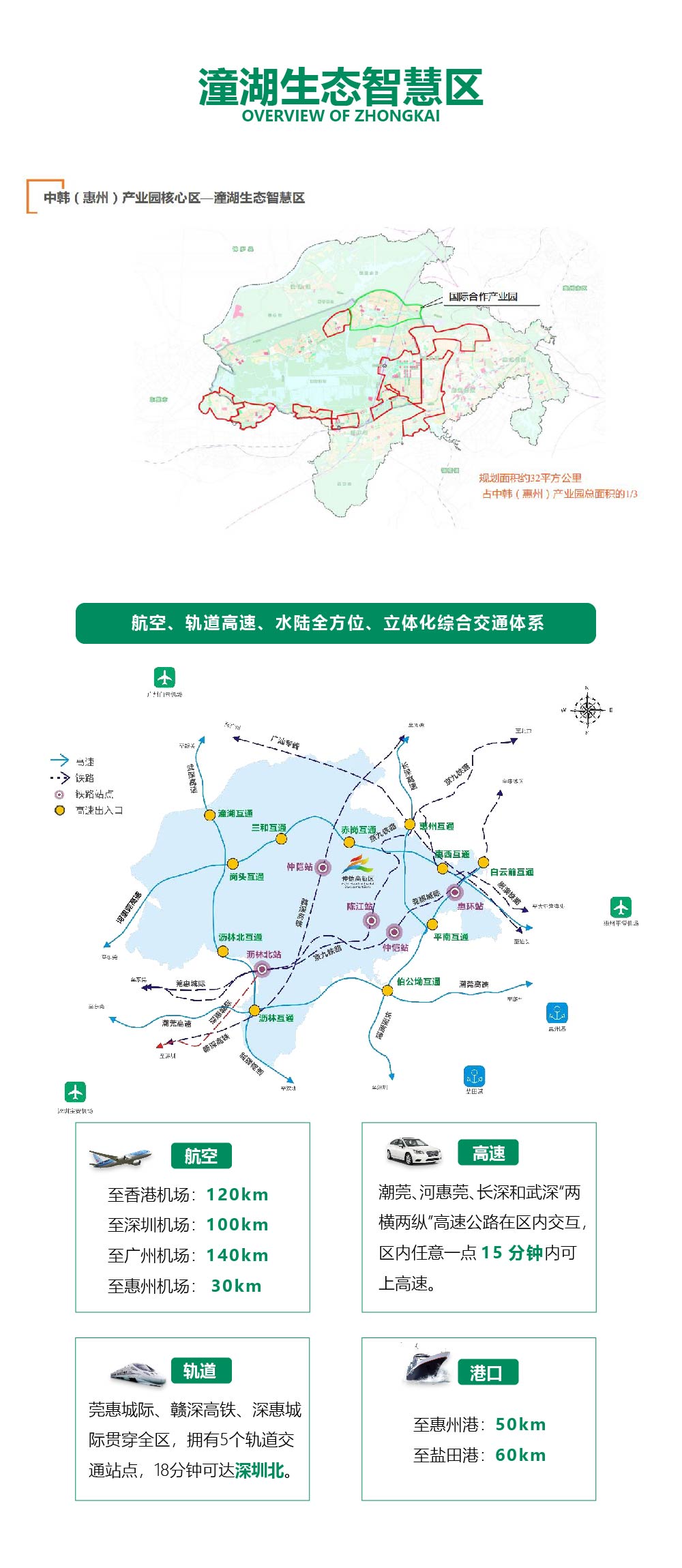 潼湖生态智慧区区位优越,是粤港澳大湾区东部交通枢纽。地处广州、深圳、香港三个国际化大都市的中心地带,距广州中心区约100公里、深圳中心区约60公里、香港中心区约100公里;周边三大机场满足出行需求,距离广州机场约140公里、深圳机场约100公里、惠州机场约30公里。